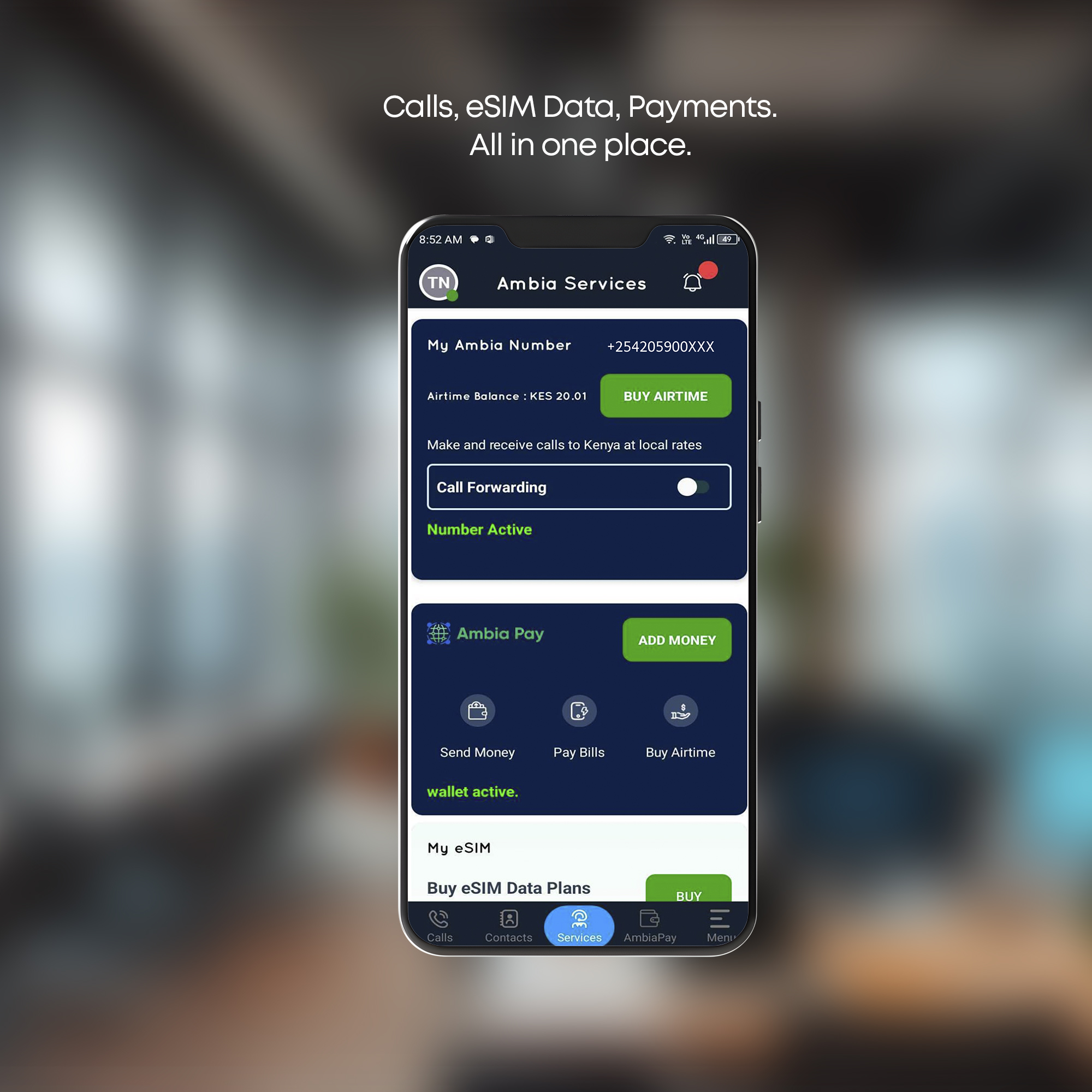 Ambia is your one-stop app for staying connected across borders. Whether you’re calling loved ones in Kenya for just KES 3/- a minute, getting eSIM mobile data in 190+ countries, or sending and receiving money with AmbiaPay, Ambia keeps you online, in touch, and in control. No roaming fees, no SIM swaps, no stress. Stay reachable anywhere.